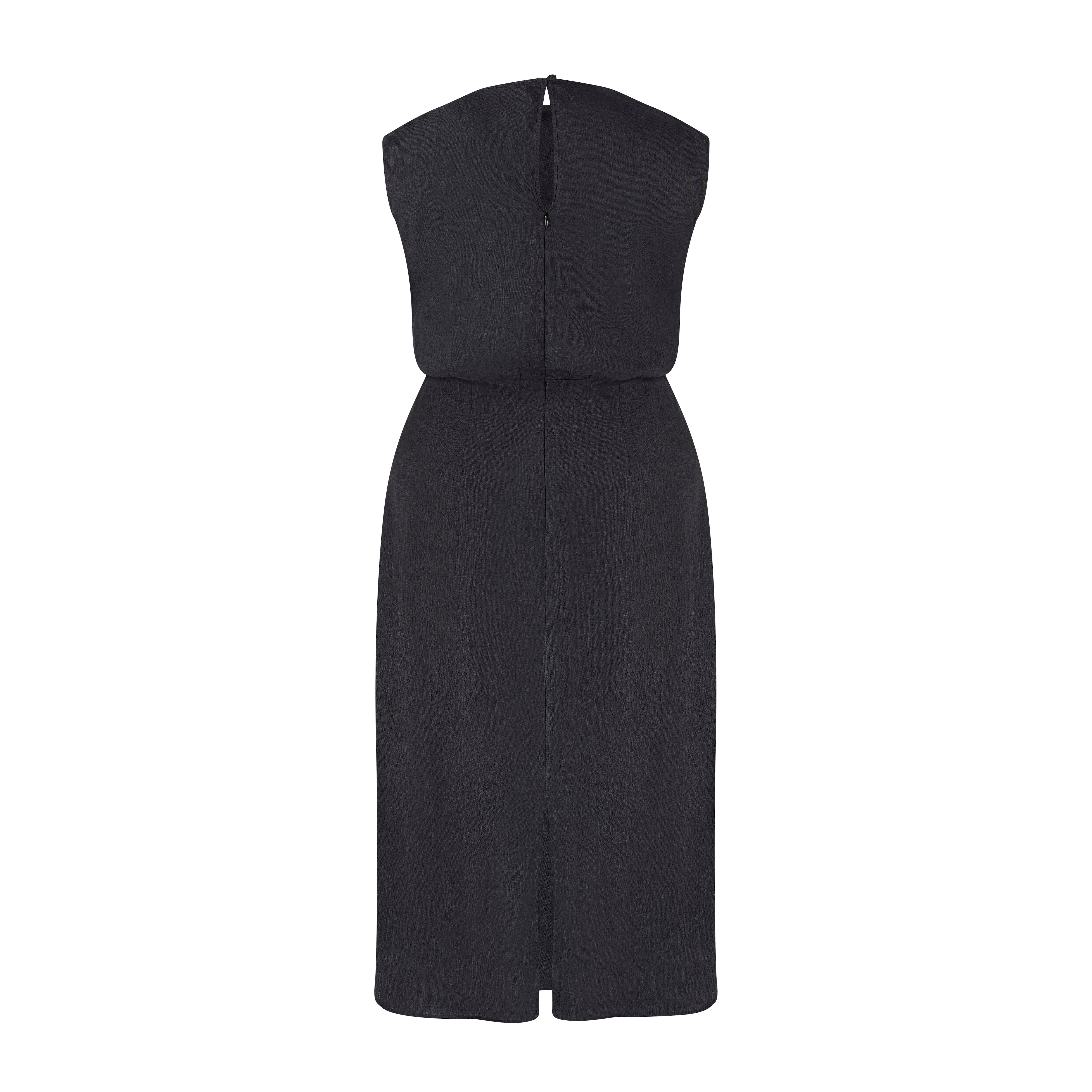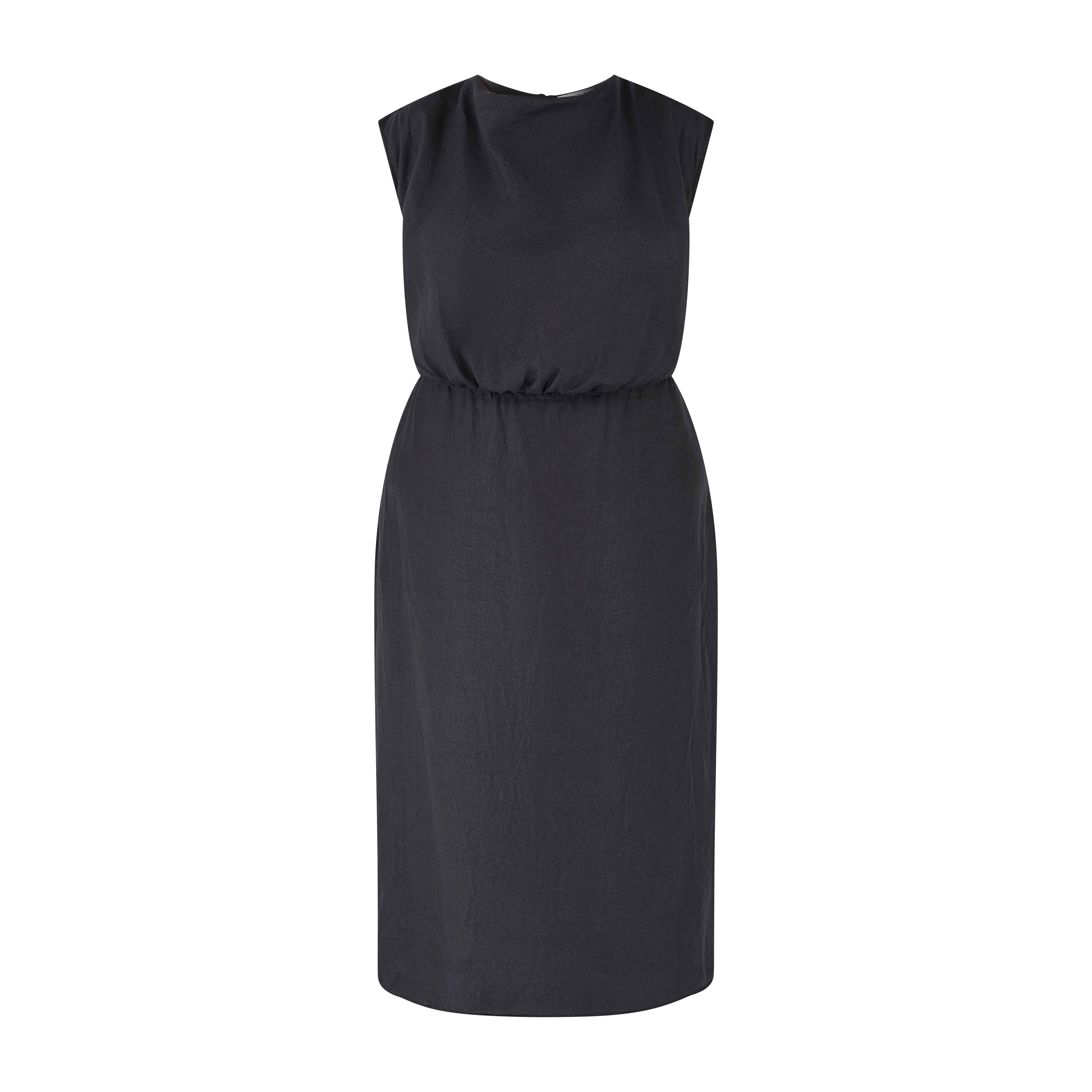 Crafted from the same high-quality linen as our other pieces, this timeless dress features a beautifully draped neckline, similar to a cowl neck, for a classic look. The design includes a cinched waist and a straight, column-style skirt with a subtle split at the back, enhancing both style and movement. Fully lined with soft cotton, this dress combines elegance and comfort, making it a perfect addition to your wardrobe.